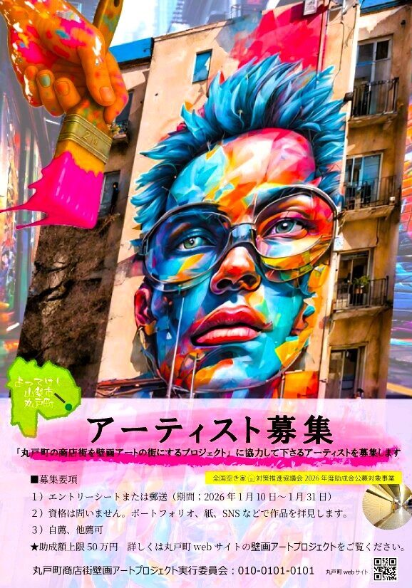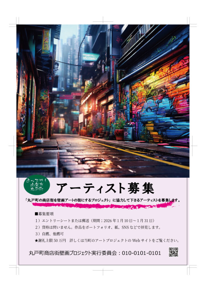 荒廃したエリアの再生の為につながる壁画アートのイメージで何か作りたかた。無料で写真を提供している美術教師の方のサイトの子の絵が気に入り、すぐに、「田舎のシャッター外でアーティスト募集しようとコンセプトが決まりました。