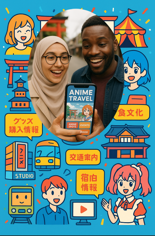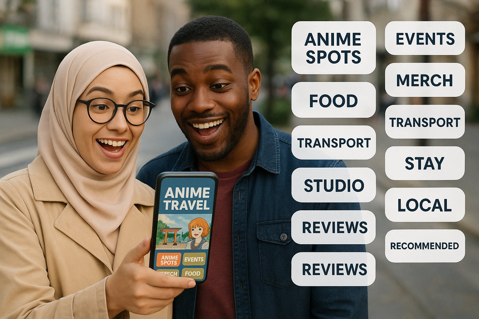 ありがとう。これはこれでとっておきます。 別のイメージでもう一つ作ってください。 ヒジャブを被った眼鏡の女性とブラックの男性2人のカップルが、ワクワクと楽しそうな表情をしながら、スマホをもってアニメの聖地をめぐる旅をしているという、というイメージの写真を作ってください。 スマホで当アニメ情報サイトを開いて見ています。 そのスマホをクローズアップして、こんな情報が見れるよ、という風な写実的なデザインを作って下さい。