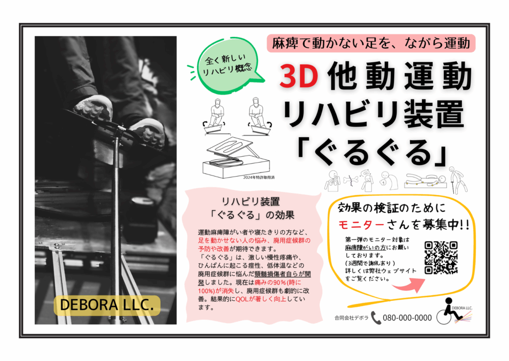 福祉用具のリハビリ機器ぐるぐるの試作会社のDMを作成しました。モニターや、研究開発の協力者を求めるためのDMです。また、縦横のバージョンを同じ素材で作る課題も行いました。